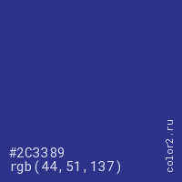 Цвет #2C3389 в цветовой модели RGB обозначается тремя октетами (44, 51, 137) в десятичном формате и #2C3389 в шестнадцатиричном (hex) формате, которые являются интенсивностью красного 44 (hex 2C), интенсивность зелёного 51 (hex 33) и интенсивность синего 137 (hex 89).
