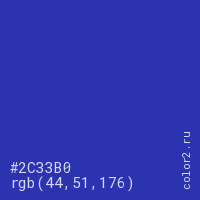 Цвет #2C33B0 в цветовой модели RGB обозначается тремя октетами (44, 51, 176) в десятичном формате и #2C33B0 в шестнадцатиричном (hex) формате, которые являются интенсивностью красного 44 (hex 2C), интенсивность зелёного 51 (hex 33) и интенсивность синего 176 (hex B0).