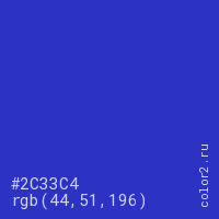 Цвет #2C33C4 в цветовой модели RGB обозначается тремя октетами (44, 51, 196) в десятичном формате и #2C33C4 в шестнадцатиричном (hex) формате, которые являются интенсивностью красного 44 (hex 2C), интенсивность зелёного 51 (hex 33) и интенсивность синего 196 (hex C4).