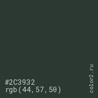 Цвет #2C3932 в цветовой модели RGB обозначается тремя октетами (44, 57, 50) в десятичном формате и #2C3932 в шестнадцатиричном (hex) формате, которые являются интенсивностью красного 44 (hex 2C), интенсивность зелёного 57 (hex 39) и интенсивность синего 50 (hex 32).