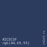 Цвет #2C3C5F в цветовой модели RGB обозначается тремя октетами (44, 60, 95) в десятичном формате и #2C3C5F в шестнадцатиричном (hex) формате, которые являются интенсивностью красного 44 (hex 2C), интенсивность зелёного 60 (hex 3C) и интенсивность синего 95 (hex 5F).