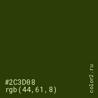 Цвет #2C3D08 в цветовой модели RGB обозначается тремя октетами (44, 61, 8) в десятичном формате и #2C3D08 в шестнадцатиричном (hex) формате, которые являются интенсивностью красного 44 (hex 2C), интенсивность зелёного 61 (hex 3D) и интенсивность синего 8 (hex 08).