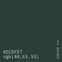 Цвет #2C3F37 в цветовой модели RGB обозначается тремя октетами (44, 63, 55) в десятичном формате и #2C3F37 в шестнадцатиричном (hex) формате, которые являются интенсивностью красного 44 (hex 2C), интенсивность зелёного 63 (hex 3F) и интенсивность синего 55 (hex 37).