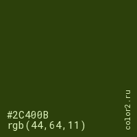 Цвет #2C400B в цветовой модели RGB обозначается тремя октетами (44, 64, 11) в десятичном формате и #2C400B в шестнадцатиричном (hex) формате, которые являются интенсивностью красного 44 (hex 2C), интенсивность зелёного 64 (hex 40) и интенсивность синего 11 (hex 0B).