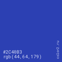 Цвет #2C40B3 в цветовой модели RGB обозначается тремя октетами (44, 64, 179) в десятичном формате и #2C40B3 в шестнадцатиричном (hex) формате, которые являются интенсивностью красного 44 (hex 2C), интенсивность зелёного 64 (hex 40) и интенсивность синего 179 (hex B3).