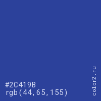 Цвет #2C419B в цветовой модели RGB обозначается тремя октетами (44, 65, 155) в десятичном формате и #2C419B в шестнадцатиричном (hex) формате, которые являются интенсивностью красного 44 (hex 2C), интенсивность зелёного 65 (hex 41) и интенсивность синего 155 (hex 9B).