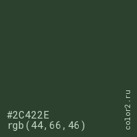 Цвет #2C422E в цветовой модели RGB обозначается тремя октетами (44, 66, 46) в десятичном формате и #2C422E в шестнадцатиричном (hex) формате, которые являются интенсивностью красного 44 (hex 2C), интенсивность зелёного 66 (hex 42) и интенсивность синего 46 (hex 2E).
