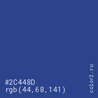 Цвет #2C448D в цветовой модели RGB обозначается тремя октетами (44, 68, 141) в десятичном формате и #2C448D в шестнадцатиричном (hex) формате, которые являются интенсивностью красного 44 (hex 2C), интенсивность зелёного 68 (hex 44) и интенсивность синего 141 (hex 8D).