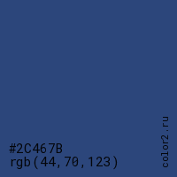 Цвет #2C467B в цветовой модели RGB обозначается тремя октетами (44, 70, 123) в десятичном формате и #2C467B в шестнадцатиричном (hex) формате, которые являются интенсивностью красного 44 (hex 2C), интенсивность зелёного 70 (hex 46) и интенсивность синего 123 (hex 7B).