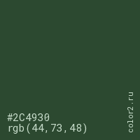 Цвет #2C4930 в цветовой модели RGB обозначается тремя октетами (44, 73, 48) в десятичном формате и #2C4930 в шестнадцатиричном (hex) формате, которые являются интенсивностью красного 44 (hex 2C), интенсивность зелёного 73 (hex 49) и интенсивность синего 48 (hex 30).