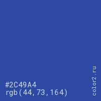 Цвет #2C49A4 в цветовой модели RGB обозначается тремя октетами (44, 73, 164) в десятичном формате и #2C49A4 в шестнадцатиричном (hex) формате, которые являются интенсивностью красного 44 (hex 2C), интенсивность зелёного 73 (hex 49) и интенсивность синего 164 (hex A4).