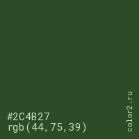 Цвет #2C4B27 в цветовой модели RGB обозначается тремя октетами (44, 75, 39) в десятичном формате и #2C4B27 в шестнадцатиричном (hex) формате, которые являются интенсивностью красного 44 (hex 2C), интенсивность зелёного 75 (hex 4B) и интенсивность синего 39 (hex 27).