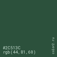 Цвет #2C513C в цветовой модели RGB обозначается тремя октетами (44, 81, 60) в десятичном формате и #2C513C в шестнадцатиричном (hex) формате, которые являются интенсивностью красного 44 (hex 2C), интенсивность зелёного 81 (hex 51) и интенсивность синего 60 (hex 3C).