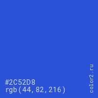 Цвет #2C52D8 в цветовой модели RGB обозначается тремя октетами (44, 82, 216) в десятичном формате и #2C52D8 в шестнадцатиричном (hex) формате, которые являются интенсивностью красного 44 (hex 2C), интенсивность зелёного 82 (hex 52) и интенсивность синего 216 (hex D8).
