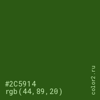 Цвет #2C5914 в цветовой модели RGB обозначается тремя октетами (44, 89, 20) в десятичном формате и #2C5914 в шестнадцатиричном (hex) формате, которые являются интенсивностью красного 44 (hex 2C), интенсивность зелёного 89 (hex 59) и интенсивность синего 20 (hex 14).