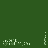 Цвет #2C591D в цветовой модели RGB обозначается тремя октетами (44, 89, 29) в десятичном формате и #2C591D в шестнадцатиричном (hex) формате, которые являются интенсивностью красного 44 (hex 2C), интенсивность зелёного 89 (hex 59) и интенсивность синего 29 (hex 1D).