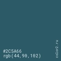 Цвет #2C5A66 в цветовой модели RGB обозначается тремя октетами (44, 90, 102) в десятичном формате и #2C5A66 в шестнадцатиричном (hex) формате, которые являются интенсивностью красного 44 (hex 2C), интенсивность зелёного 90 (hex 5A) и интенсивность синего 102 (hex 66).