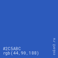 Цвет #2C5ABC в цветовой модели RGB обозначается тремя октетами (44, 90, 188) в десятичном формате и #2C5ABC в шестнадцатиричном (hex) формате, которые являются интенсивностью красного 44 (hex 2C), интенсивность зелёного 90 (hex 5A) и интенсивность синего 188 (hex BC).