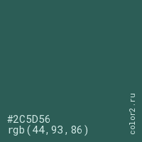 Цвет #2C5D56 в цветовой модели RGB обозначается тремя октетами (44, 93, 86) в десятичном формате и #2C5D56 в шестнадцатиричном (hex) формате, которые являются интенсивностью красного 44 (hex 2C), интенсивность зелёного 93 (hex 5D) и интенсивность синего 86 (hex 56).