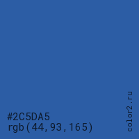 Цвет #2C5DA5 в цветовой модели RGB обозначается тремя октетами (44, 93, 165) в десятичном формате и #2C5DA5 в шестнадцатиричном (hex) формате, которые являются интенсивностью красного 44 (hex 2C), интенсивность зелёного 93 (hex 5D) и интенсивность синего 165 (hex A5).