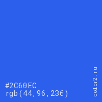 Цвет #2C60EC в цветовой модели RGB обозначается тремя октетами (44, 96, 236) в десятичном формате и #2C60EC в шестнадцатиричном (hex) формате, которые являются интенсивностью красного 44 (hex 2C), интенсивность зелёного 96 (hex 60) и интенсивность синего 236 (hex EC).