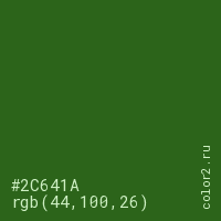 Цвет #2C641A в цветовой модели RGB обозначается тремя октетами (44, 100, 26) в десятичном формате и #2C641A в шестнадцатиричном (hex) формате, которые являются интенсивностью красного 44 (hex 2C), интенсивность зелёного 100 (hex 64) и интенсивность синего 26 (hex 1A).
