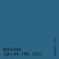 Цвет #2C6484 в цветовой модели RGB обозначается тремя октетами (44, 100, 132) в десятичном формате и #2C6484 в шестнадцатиричном (hex) формате, которые являются интенсивностью красного 44 (hex 2C), интенсивность зелёного 100 (hex 64) и интенсивность синего 132 (hex 84).
