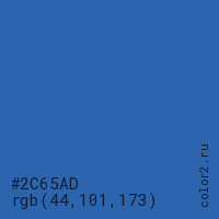Цвет #2C65AD в цветовой модели RGB обозначается тремя октетами (44, 101, 173) в десятичном формате и #2C65AD в шестнадцатиричном (hex) формате, которые являются интенсивностью красного 44 (hex 2C), интенсивность зелёного 101 (hex 65) и интенсивность синего 173 (hex AD).