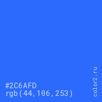 Цвет RGB(44, 106, 253) в процентом отношении количества цвета состоит из 17.3% красного (red), 41.6% зелёного (green) и 99.2% синего (blue).