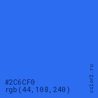 Цвет #2C6CF0 в цветовой модели RGB обозначается тремя октетами (44, 108, 240) в десятичном формате и #2C6CF0 в шестнадцатиричном (hex) формате, которые являются интенсивностью красного 44 (hex 2C), интенсивность зелёного 108 (hex 6C) и интенсивность синего 240 (hex F0).