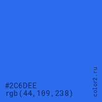 Цвет #2C6DEE в цветовой модели RGB обозначается тремя октетами (44, 109, 238) в десятичном формате и #2C6DEE в шестнадцатиричном (hex) формате, которые являются интенсивностью красного 44 (hex 2C), интенсивность зелёного 109 (hex 6D) и интенсивность синего 238 (hex EE).