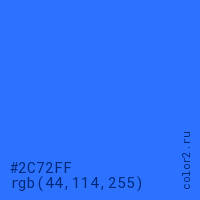 Цвет #2C72FF в цветовой модели RGB обозначается тремя октетами (44, 114, 255) в десятичном формате и #2C72FF в шестнадцатиричном (hex) формате, которые являются интенсивностью красного 44 (hex 2C), интенсивность зелёного 114 (hex 72) и интенсивность синего 255 (hex FF).