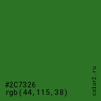 Цвет #2C7326 в цветовой модели RGB обозначается тремя октетами (44, 115, 38) в десятичном формате и #2C7326 в шестнадцатиричном (hex) формате, которые являются интенсивностью красного 44 (hex 2C), интенсивность зелёного 115 (hex 73) и интенсивность синего 38 (hex 26).