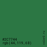 Цвет #2C7744 в цветовой модели RGB обозначается тремя октетами (44, 119, 68) в десятичном формате и #2C7744 в шестнадцатиричном (hex) формате, которые являются интенсивностью красного 44 (hex 2C), интенсивность зелёного 119 (hex 77) и интенсивность синего 68 (hex 44).