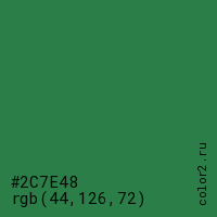 Цвет #2C7E48 в цветовой модели RGB обозначается тремя октетами (44, 126, 72) в десятичном формате и #2C7E48 в шестнадцатиричном (hex) формате, которые являются интенсивностью красного 44 (hex 2C), интенсивность зелёного 126 (hex 7E) и интенсивность синего 72 (hex 48).
