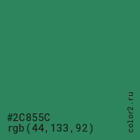 Цвет #2C855C в цветовой модели RGB обозначается тремя октетами (44, 133, 92) в десятичном формате и #2C855C в шестнадцатиричном (hex) формате, которые являются интенсивностью красного 44 (hex 2C), интенсивность зелёного 133 (hex 85) и интенсивность синего 92 (hex 5C).