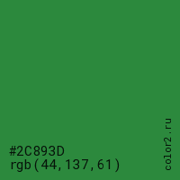 Цвет #2C893D в цветовой модели RGB обозначается тремя октетами (44, 137, 61) в десятичном формате и #2C893D в шестнадцатиричном (hex) формате, которые являются интенсивностью красного 44 (hex 2C), интенсивность зелёного 137 (hex 89) и интенсивность синего 61 (hex 3D).