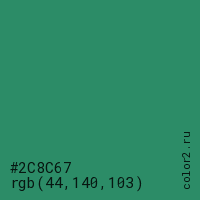 Цвет #2C8C67 в цветовой модели RGB обозначается тремя октетами (44, 140, 103) в десятичном формате и #2C8C67 в шестнадцатиричном (hex) формате, которые являются интенсивностью красного 44 (hex 2C), интенсивность зелёного 140 (hex 8C) и интенсивность синего 103 (hex 67).
