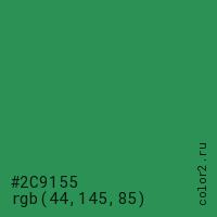 Цвет #2C9155 в цветовой модели RGB обозначается тремя октетами (44, 145, 85) в десятичном формате и #2C9155 в шестнадцатиричном (hex) формате, которые являются интенсивностью красного 44 (hex 2C), интенсивность зелёного 145 (hex 91) и интенсивность синего 85 (hex 55).