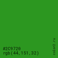 Цвет #2C9720 в цветовой модели RGB обозначается тремя октетами (44, 151, 32) в десятичном формате и #2C9720 в шестнадцатиричном (hex) формате, которые являются интенсивностью красного 44 (hex 2C), интенсивность зелёного 151 (hex 97) и интенсивность синего 32 (hex 20).