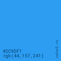 Цвет #2C9DF1 в цветовой модели RGB обозначается тремя октетами (44, 157, 241) в десятичном формате и #2C9DF1 в шестнадцатиричном (hex) формате, которые являются интенсивностью красного 44 (hex 2C), интенсивность зелёного 157 (hex 9D) и интенсивность синего 241 (hex F1).