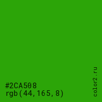 Цвет #2CA508 в цветовой модели RGB обозначается тремя октетами (44, 165, 8) в десятичном формате и #2CA508 в шестнадцатиричном (hex) формате, которые являются интенсивностью красного 44 (hex 2C), интенсивность зелёного 165 (hex A5) и интенсивность синего 8 (hex 08).