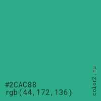 Цвет #2CAC88 в цветовой модели RGB обозначается тремя октетами (44, 172, 136) в десятичном формате и #2CAC88 в шестнадцатиричном (hex) формате, которые являются интенсивностью красного 44 (hex 2C), интенсивность зелёного 172 (hex AC) и интенсивность синего 136 (hex 88).