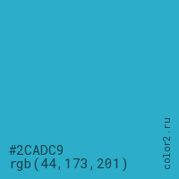 Цвет #2CADC9 в цветовой модели RGB обозначается тремя октетами (44, 173, 201) в десятичном формате и #2CADC9 в шестнадцатиричном (hex) формате, которые являются интенсивностью красного 44 (hex 2C), интенсивность зелёного 173 (hex AD) и интенсивность синего 201 (hex C9).
