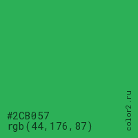 Цвет #2CB057 в цветовой модели RGB обозначается тремя октетами (44, 176, 87) в десятичном формате и #2CB057 в шестнадцатиричном (hex) формате, которые являются интенсивностью красного 44 (hex 2C), интенсивность зелёного 176 (hex B0) и интенсивность синего 87 (hex 57).