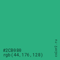 Цвет #2CB080 в цветовой модели RGB обозначается тремя октетами (44, 176, 128) в десятичном формате и #2CB080 в шестнадцатиричном (hex) формате, которые являются интенсивностью красного 44 (hex 2C), интенсивность зелёного 176 (hex B0) и интенсивность синего 128 (hex 80).