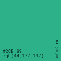 Цвет #2CB189 в цветовой модели RGB обозначается тремя октетами (44, 177, 137) в десятичном формате и #2CB189 в шестнадцатиричном (hex) формате, которые являются интенсивностью красного 44 (hex 2C), интенсивность зелёного 177 (hex B1) и интенсивность синего 137 (hex 89).