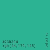 Цвет #2CB394 в цветовой модели RGB обозначается тремя октетами (44, 179, 148) в десятичном формате и #2CB394 в шестнадцатиричном (hex) формате, которые являются интенсивностью красного 44 (hex 2C), интенсивность зелёного 179 (hex B3) и интенсивность синего 148 (hex 94).