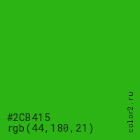 Цвет #2CB415 в цветовой модели RGB обозначается тремя октетами (44, 180, 21) в десятичном формате и #2CB415 в шестнадцатиричном (hex) формате, которые являются интенсивностью красного 44 (hex 2C), интенсивность зелёного 180 (hex B4) и интенсивность синего 21 (hex 15).
