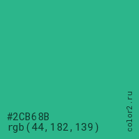 Цвет #2CB68B в цветовой модели RGB обозначается тремя октетами (44, 182, 139) в десятичном формате и #2CB68B в шестнадцатиричном (hex) формате, которые являются интенсивностью красного 44 (hex 2C), интенсивность зелёного 182 (hex B6) и интенсивность синего 139 (hex 8B).